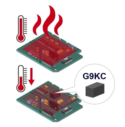 G9KC型為低接觸電阻(初始值:6mΩ以下)可以抑制發熱。因此,可抑制充電樁殼體內的局部溫度上升,延緩因周邊元器件發熱引起的劣化速度,降低故障風險,為延長設備壽命做貢獻。此外,還提高了基板設計的自由度。