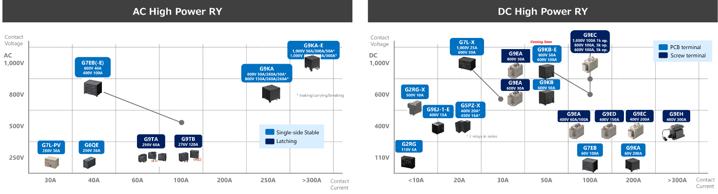 G9KB-E是G9KB系列的高容量型號,雖然其尺寸和重量與G9KB標準型相同,但將最大開關電壓擴展到800V DC,最大載流電流擴展到100A。DC800V 50A和DC600V 100A的額定值特別適合儲能系統和EV充電器/V2X等15-40kW級蓄電池相關應用。