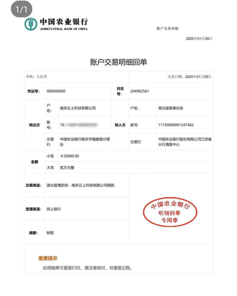 2020年1月29日,南京云上科技有限公司通過湖北省慈善總會捐贈20000元用于湖北疫情防控,綿薄之力支援疫區,共同抗擊病毒。讓我們與愛同行,助力湖北,眾志成城,共渡難關!